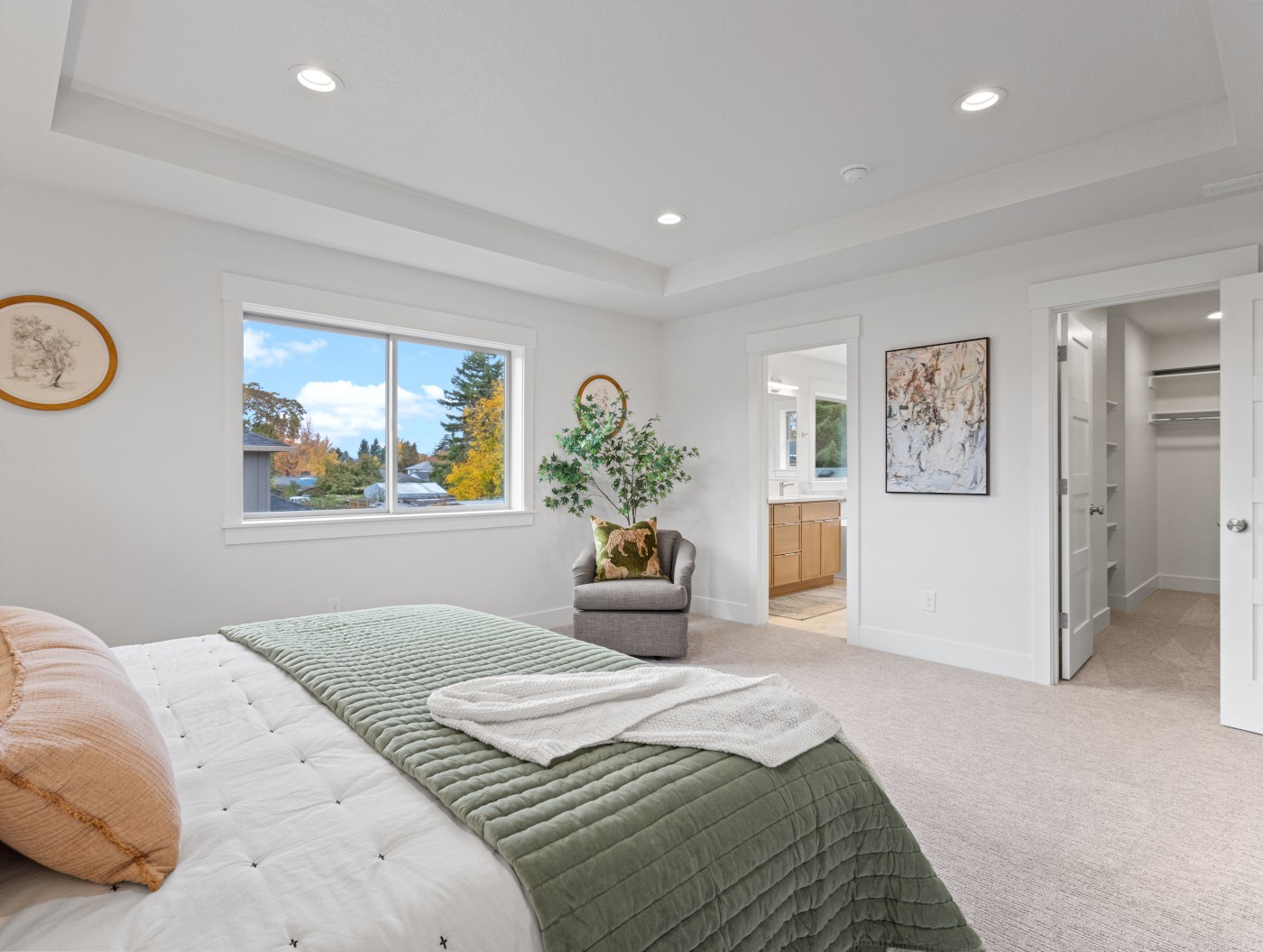 Upstairs, the primary suite features a deep walk-in closet and a luxurious bathroom with a soaking tub, dual vanity, and beautifully tiled walk-in shower. The two front bedrooms have a serene, treehouse-like feel, with windows that look out toward a magnificent Douglas fir and the always-inviting Essex Park. A fourth bedroom on the main level provides a perfect space for a home office or guest room.